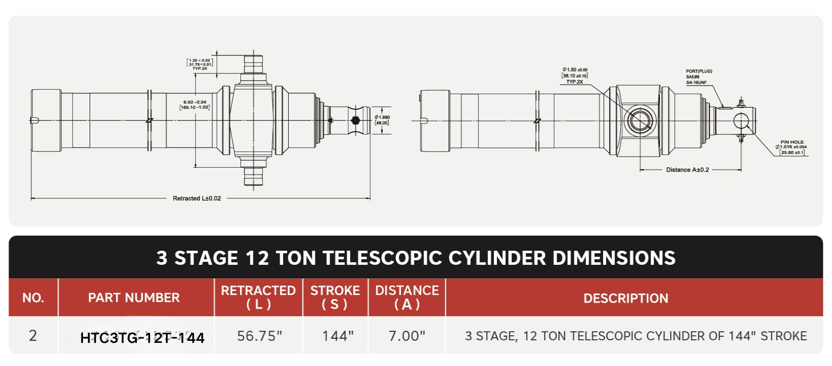 "HTC3TG-12T-144", 3 স্টেজ, 144 এর 12 টন" স্ট্রোক টেলিস্কোপিক সিলিন্ডার