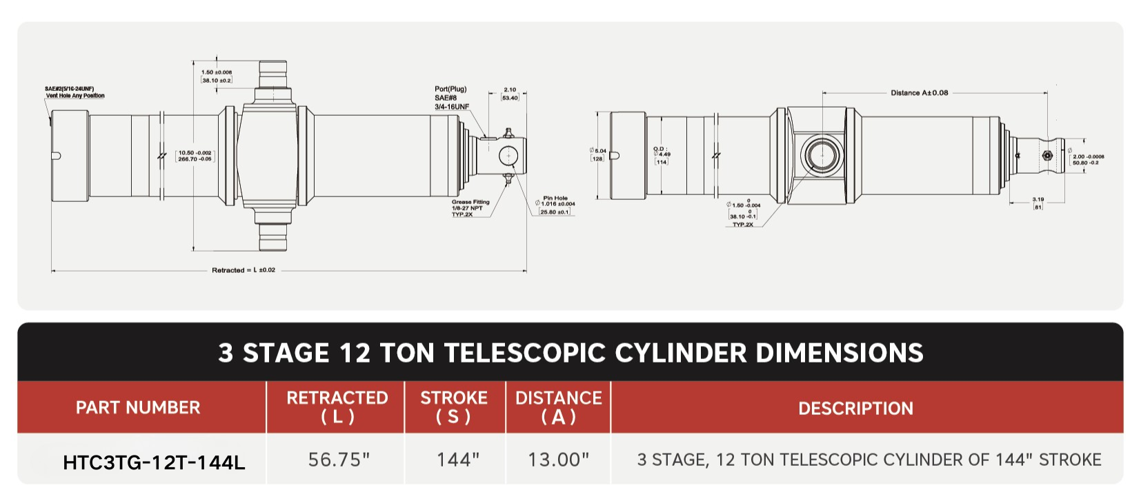 "HTC3TG-12T-144L", 3 স্টেজ, 144 এর 12 টন" স্ট্রোক 13"ট্রুনিয়ন ডিসটেন্স টেলিস্কোপিক সিলিন্ডার