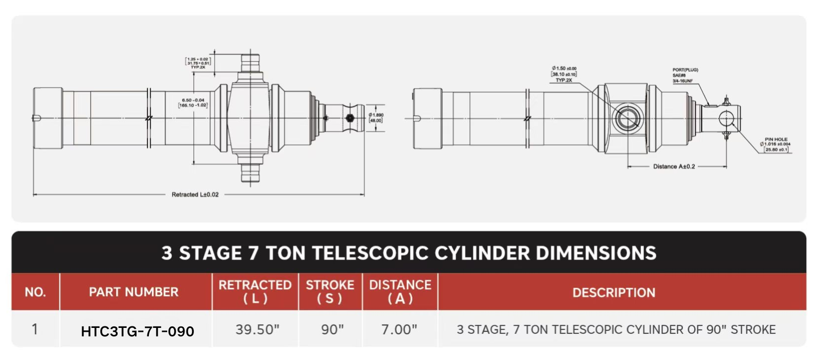 "HTC3TG-7T-090", 3 স্টেজ, 90 এর 7 টন" স্ট্রোক টেলিস্কোপিক সিলিন্ডার