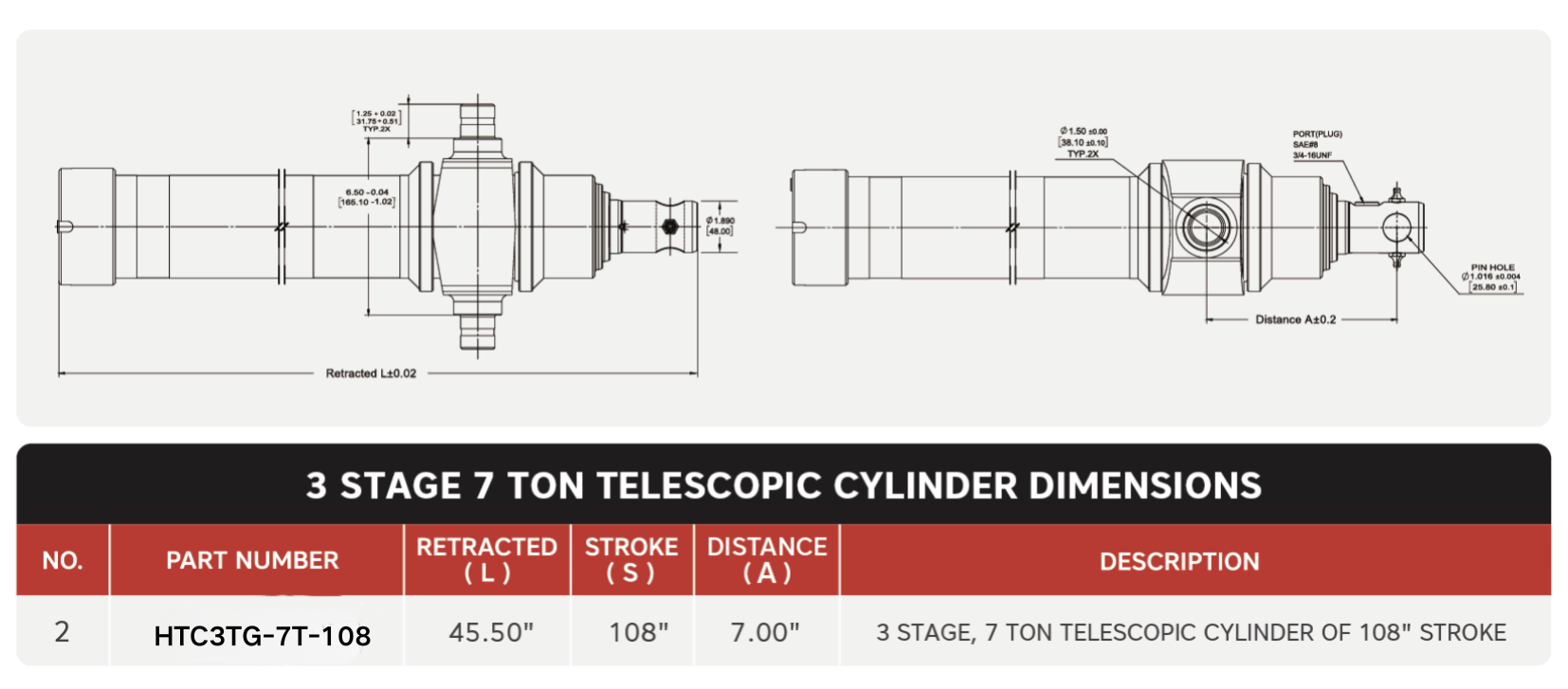 "HTC3TG-7T-108", 3 স্টেজ, 7 টন অফ 108" স্ট্রোক টেলিস্কোপিক সিলিন্ডার