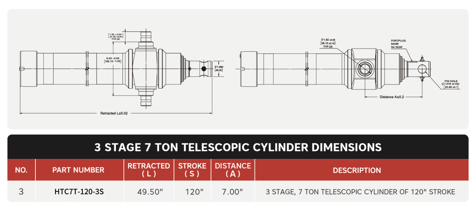 "HTC3TG-7T-120", 3 স্টেজ, 7 টন অফ 120" স্ট্রোক টেলিস্কোপিক সিলিন্ডার