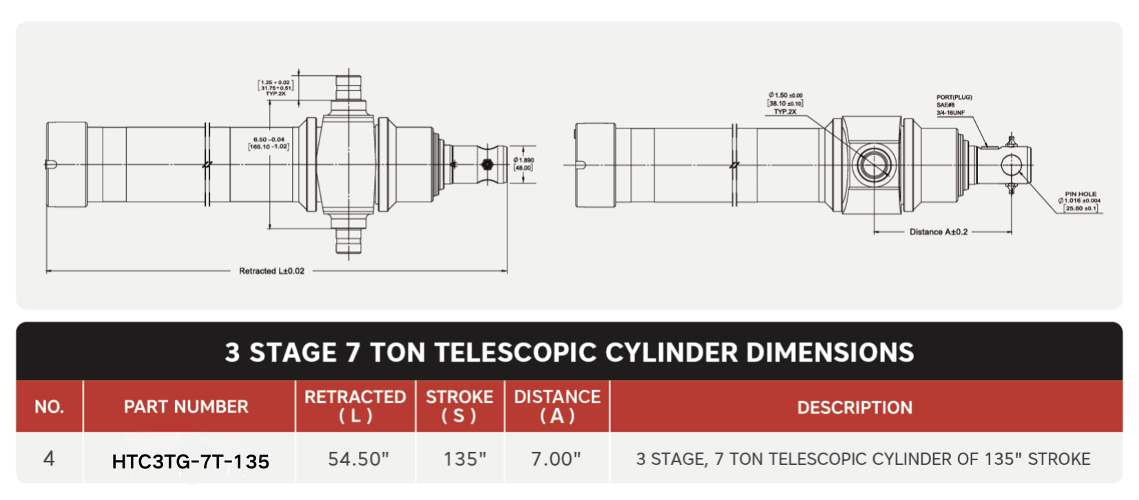 "HTC3TG-7T-135", 3 স্টেজ, 7 টন অফ 135" স্ট্রোক টেলিস্কোপিক সিলিন্ডার